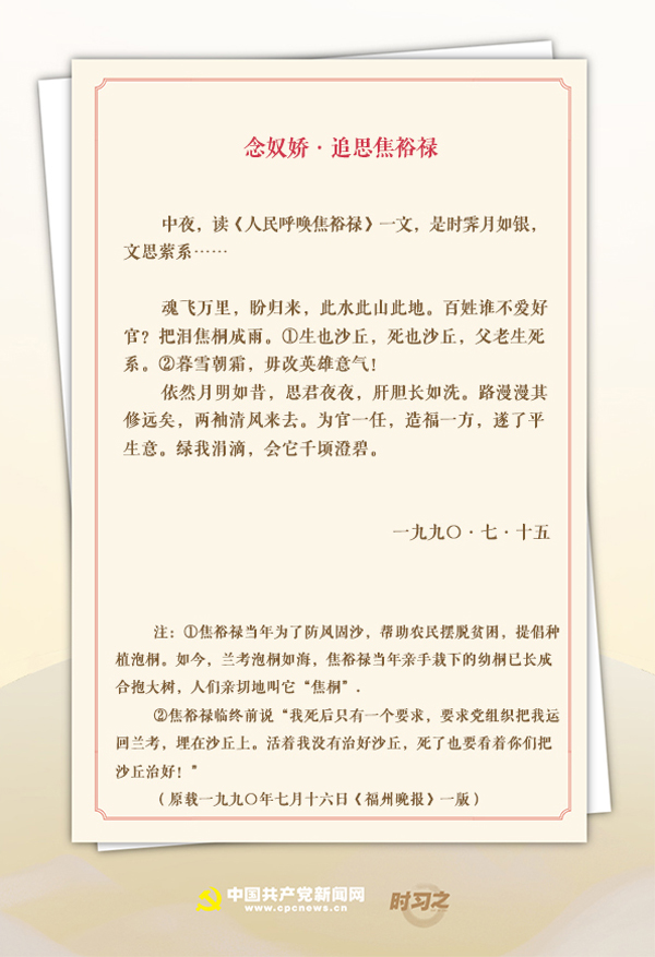 “中夜,读《人民呼唤焦裕禄》一文,是时霁月如银,文思萦系……”1990年7月15日,时任福州市委书记的习近平写下《念奴娇·追思焦裕禄》。